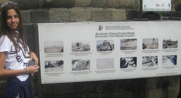 Na ovoj tabli uz hram prikazano je raščišćavanje posle erupcije Merkapija a koje je počelo 1975 do 1982.