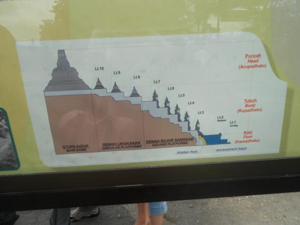 Penjući se gore imamo tako 6 koncentričnih kvadratnih platformi a onda 3 kružne koncentrične platforme koje se na vrhu završavaju velikom stupom.