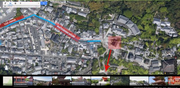 Ја мислим да је дуплирање да се од Кијомизу иде скроз до Гиона, па од Гиона до Фушими Инари. Мислим да кроз ту улицу (Мацубара Доори) свакако мораш проћи пешке. Јавни превоз, па и такси иду само до подножја одакле почиње та улица (ако на исту мислимо ја и Јојоги, ставио сам слику, надам се да неће бити мала сад). Ја сам рачунао да имаш око два сата у Којимизу са све пењањем и спуштањем.