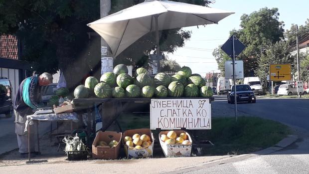 Po povratku , vidim prodaju se lubenice bez vidljivo napisane cene .Ranijih godina, sikao sam, bile su 30 din/kg.A sezona prodaje je već prešla zenit, nisu rane..